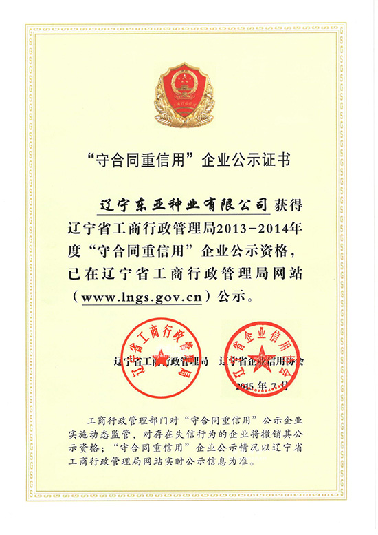辽宁东亚种业、辽宁富友种业获得“守合同重信用”企业公示证书