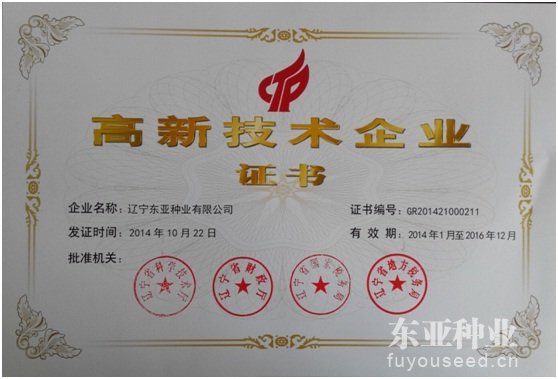 经辽宁省高新技术企业认定管理工作领导小组认定,并经报全国高新技术企业认定管理工作领导小组办公室备案审核,认定辽宁东亚种业有限公司为高新技术企业,这是继2008年公司获得首批高新技术企业后再获此殊荣。