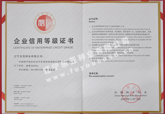 辽宁东亚种业有限公司被评为“AAA级信用企业”